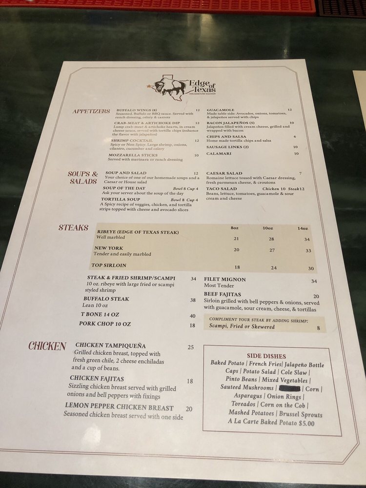 Edge of Texas Steakhouse & Saloon is a well-rounded establishment offering a variety of amenities such as outdoor seating, wheelchair accessibility, and even cryptocurrency payment options. The menu boasts a range of tempting starters like Cheesesticks and Poppers and Texas Toothpicks. Their fajitas are a standout, with options for both chicken and beef served with all the fixings. Customer reviews rave about the quality and flavor of the dishes, with one mentioning the delicious buffalo steak and another praising the friendly atmosphere. The charming decor and old-fashioned music create a unique dining experience, transporting diners back in time. Not to be missed is the perfectly grilled 10 oz Ribeye, known as the Edge of Texas Steak, paired with a vinaigrette-topped salad and a decadent cheesecake dessert. For a memorable dining experience in El Paso or Alamogordo, Edge of Texas is a must-visit destination.